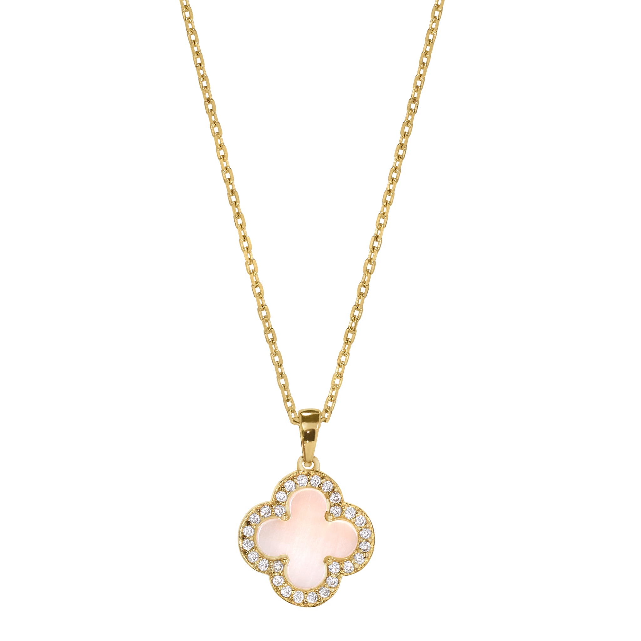Gold vermeil sterling silver clover pendant with pink mop and simulated diamonds on 16-18 adjustable cable chain