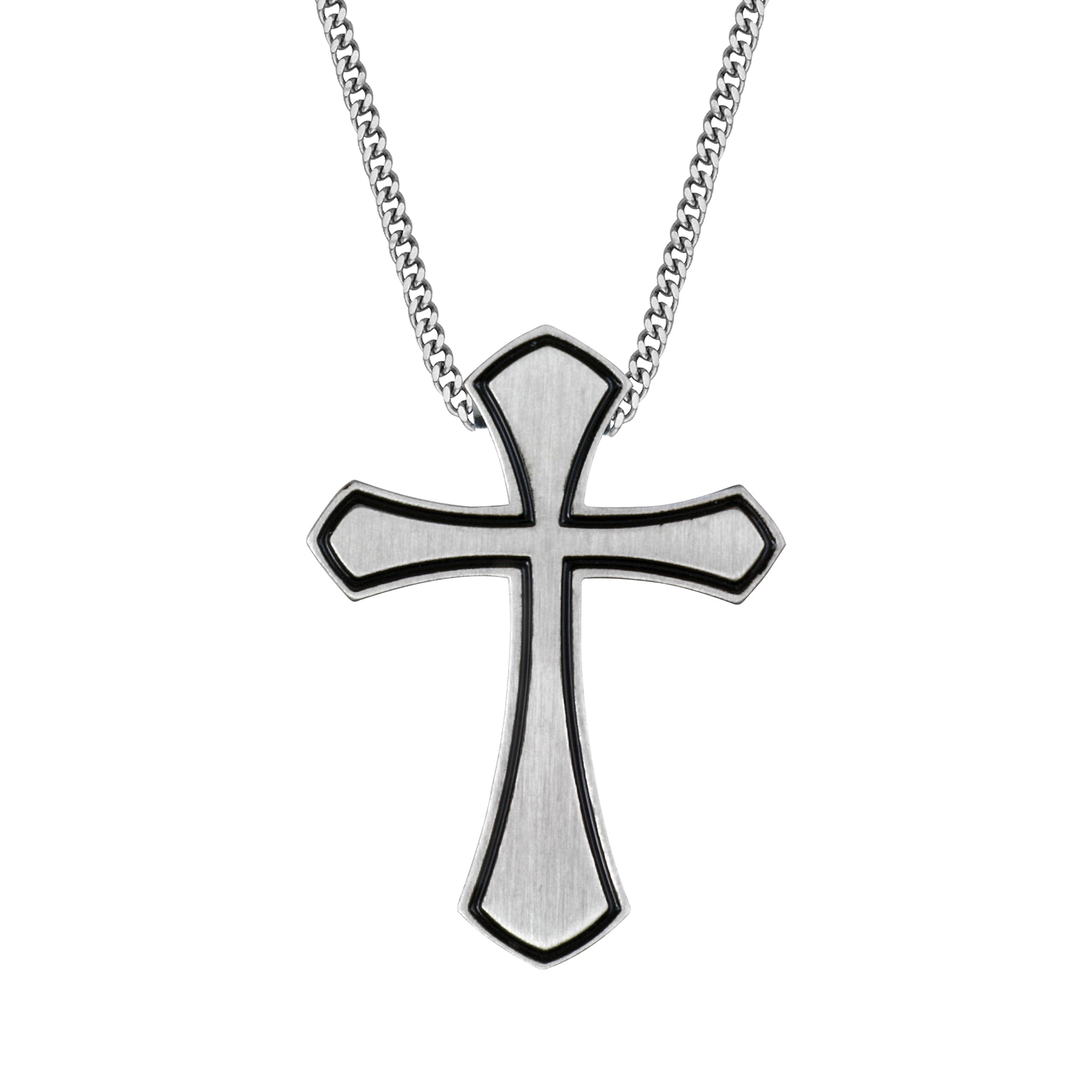 Explore timeless style with our mens stainless steel Passion Cross necklace, featuring a sleek black pinstripe border on a 24 chain. Perfect for adding a touch of bold sophistication to your ensemble.