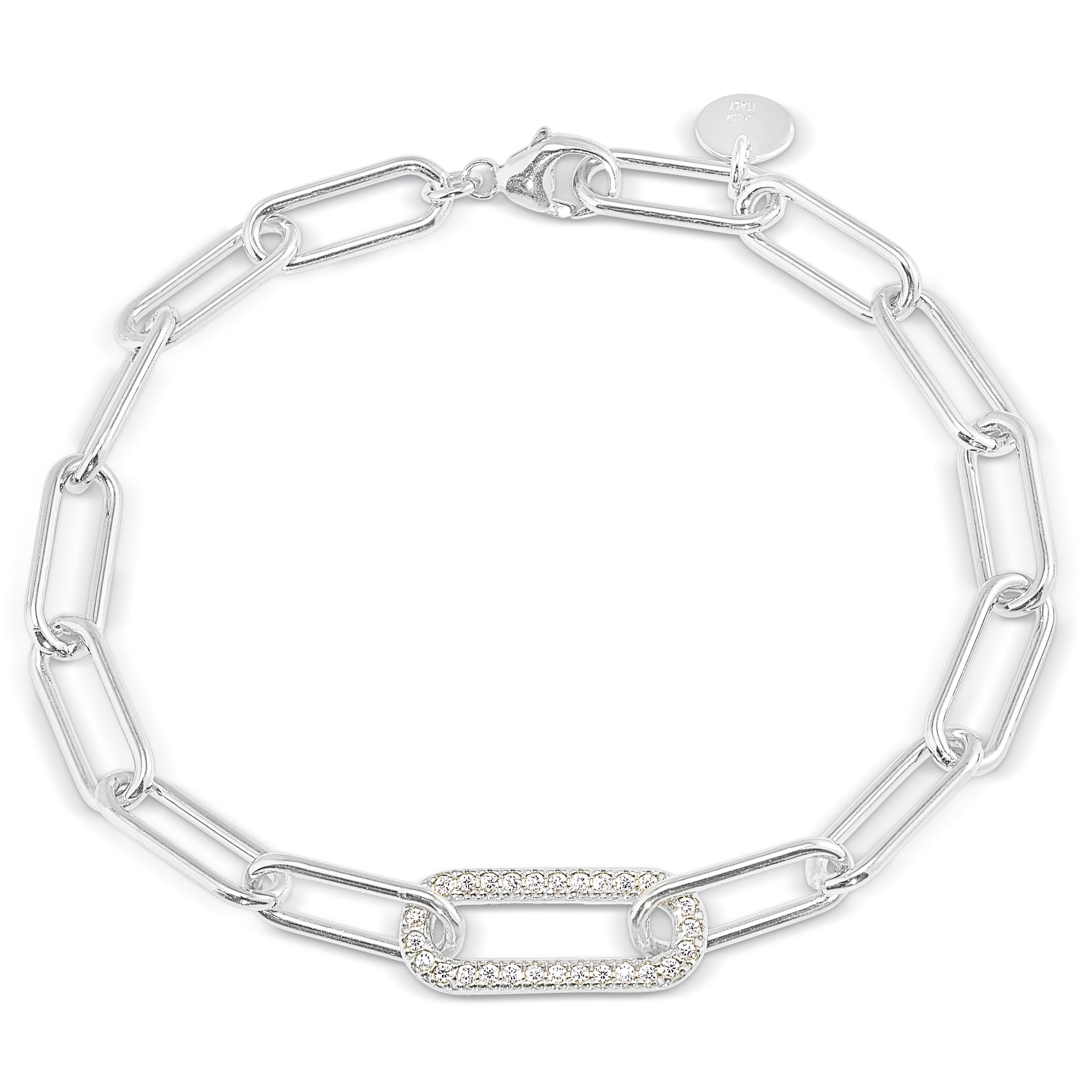 Elevate your wrist with our platinum finish sterling silver paper clip bracelet. Featuring a central link adorned with micropave simulated diamonds, this 7.5 bracelet adds a touch of elegance and sparkle to any ensemble