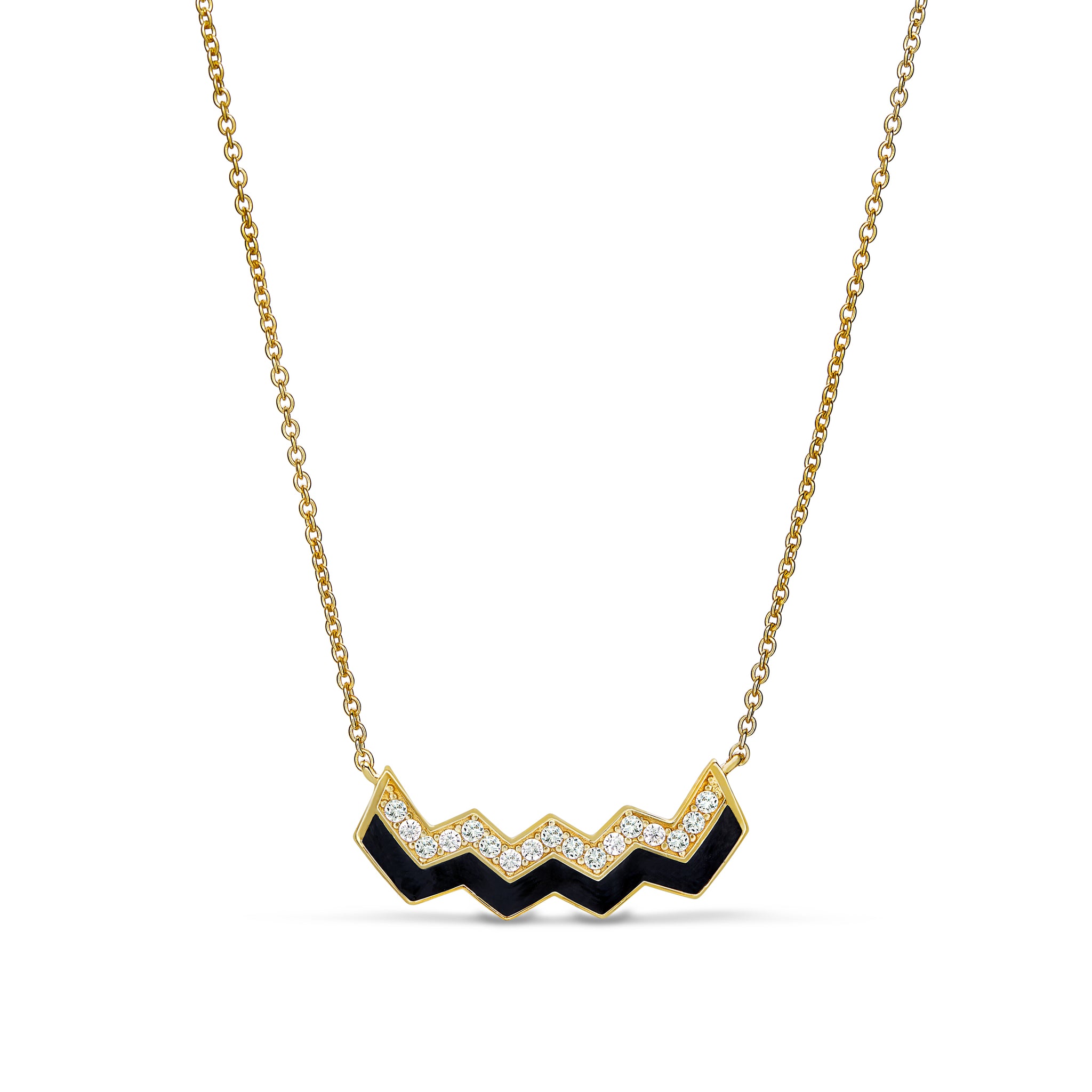 Embrace lifes journey with our gold vermeil finish sterling silver Ups and Downs necklace. Its zigzag design of simulated diamonds and black enamel on a 16-18 adjustable chain
