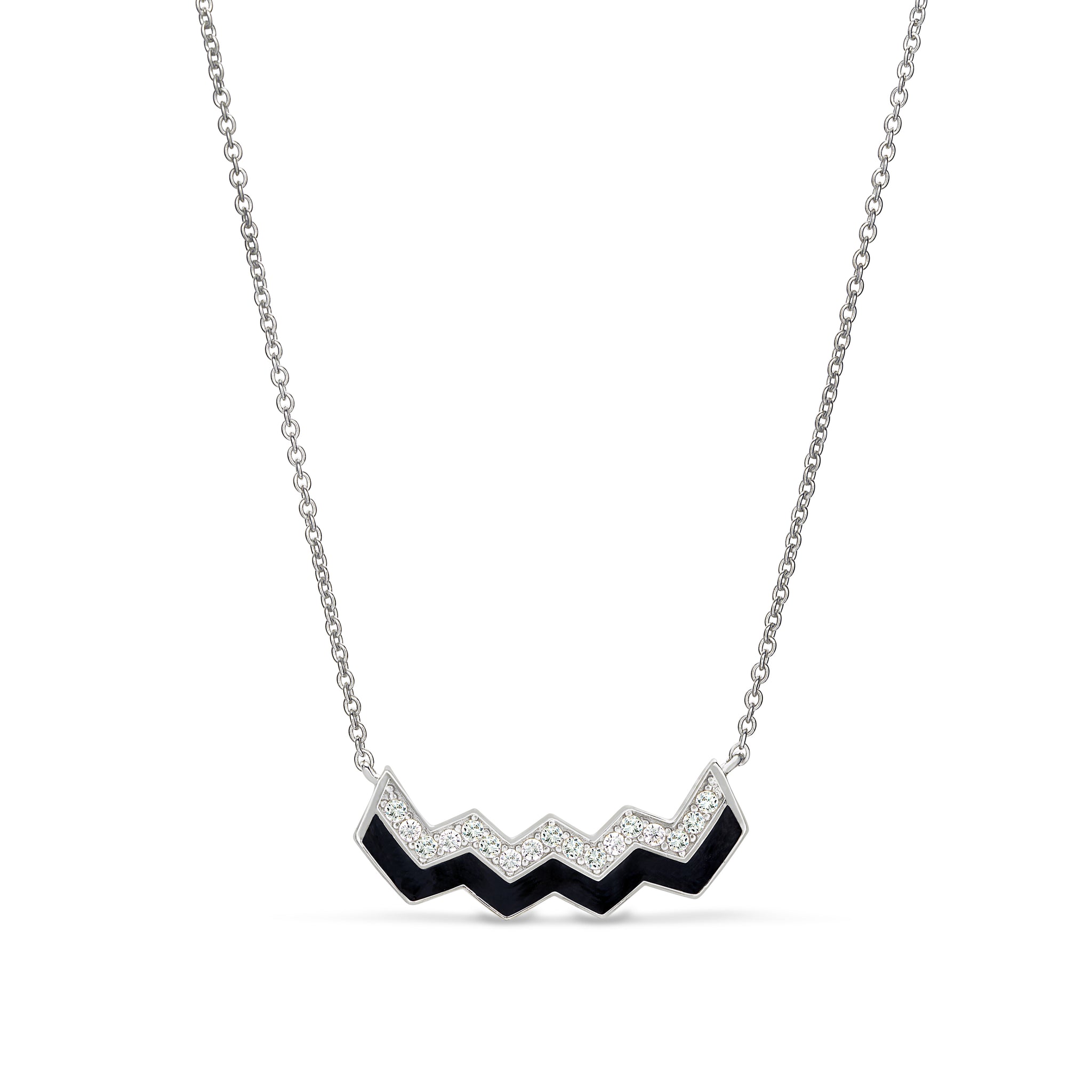 Platinum Finish Sterling Silver Micropave Ups and Downs Necklace with Black Enamel and Simulated Diamonds - 16 - 18 Adjustable Chain