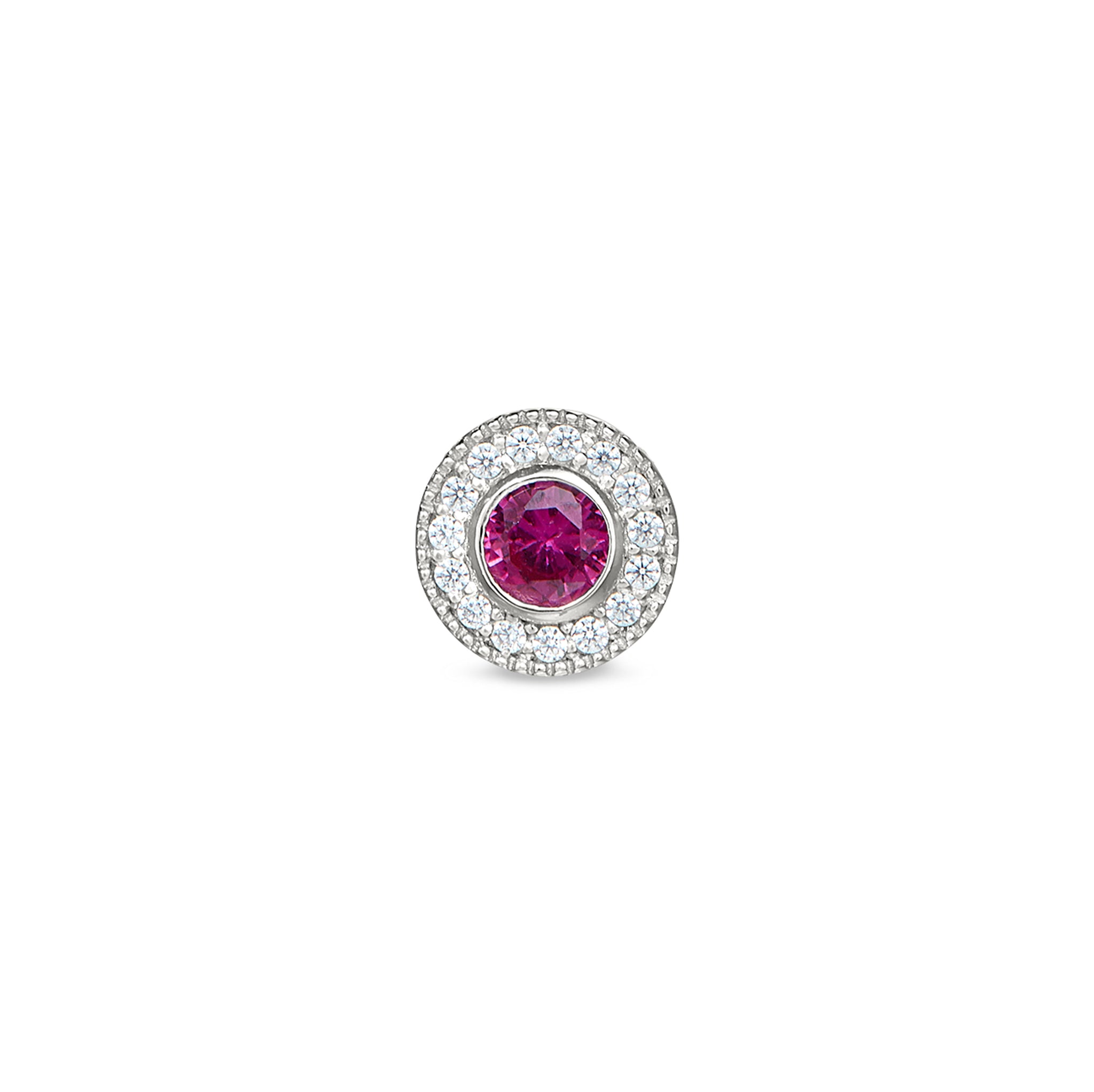 Elevate gifting with our platinum finish sterling silver pendant charm featuring a July birthstone simulated ruby & simulated diamond halo.