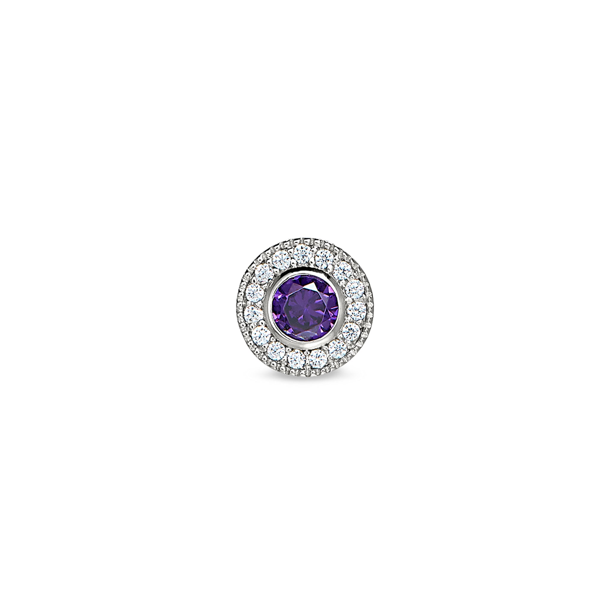 Elevate gifting with our platinum finish sterling silver pendant charm featuring a February birthstone simulated amethyst & simulated diamond halo.