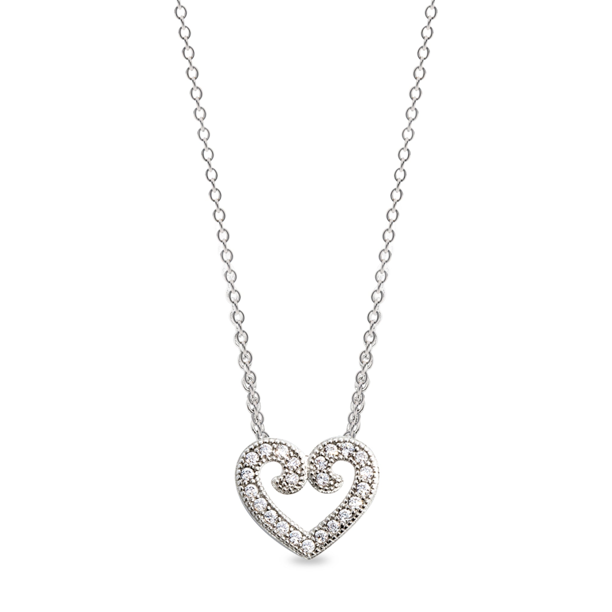 Cherish elegance with our platinum finished sterling silver heart pendant. Delicately crafted with swirl details and suspended on an 18 chain, its a timeless symbol of love.