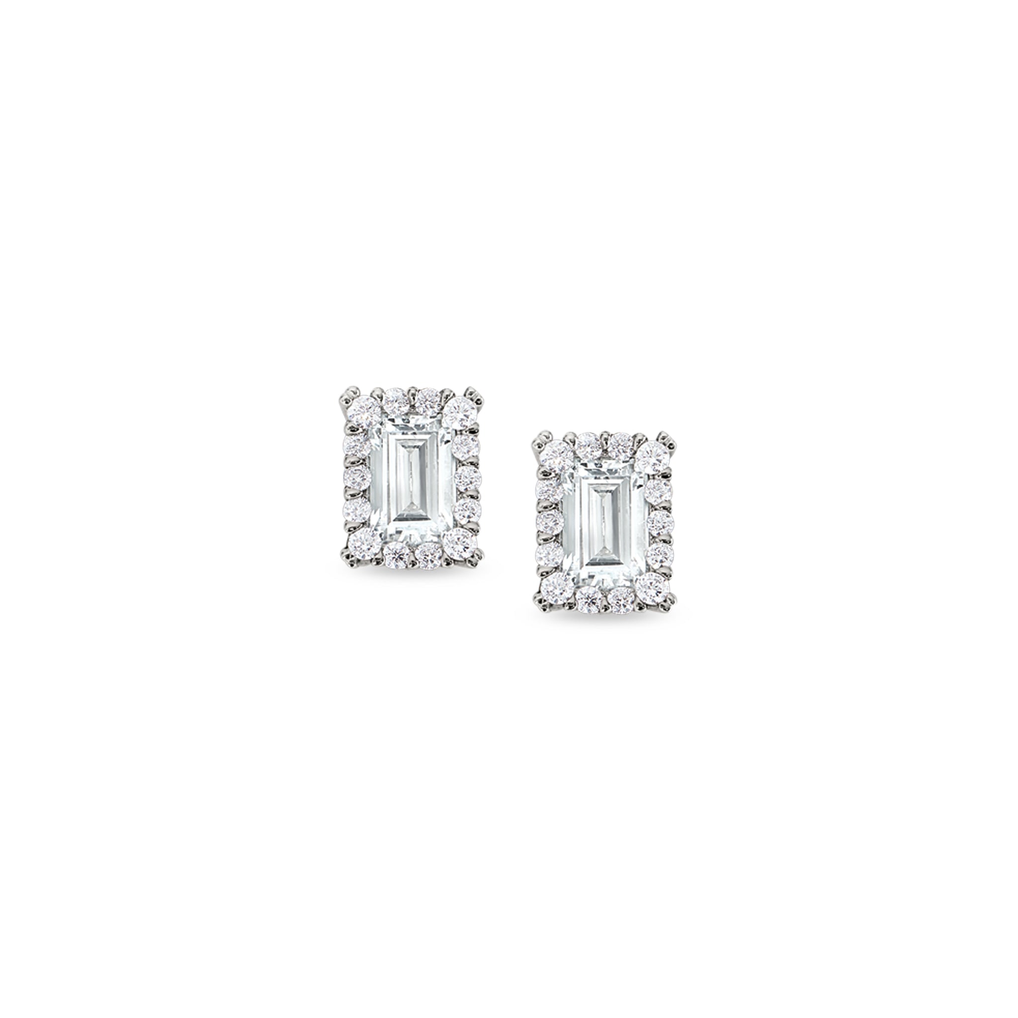 Elevate elegance with our platinum finish sterling silver stud earrings. Featuring emerald-cut simulated diamonds and simulated diamond halos, theyre a timeless statement of sophistication.