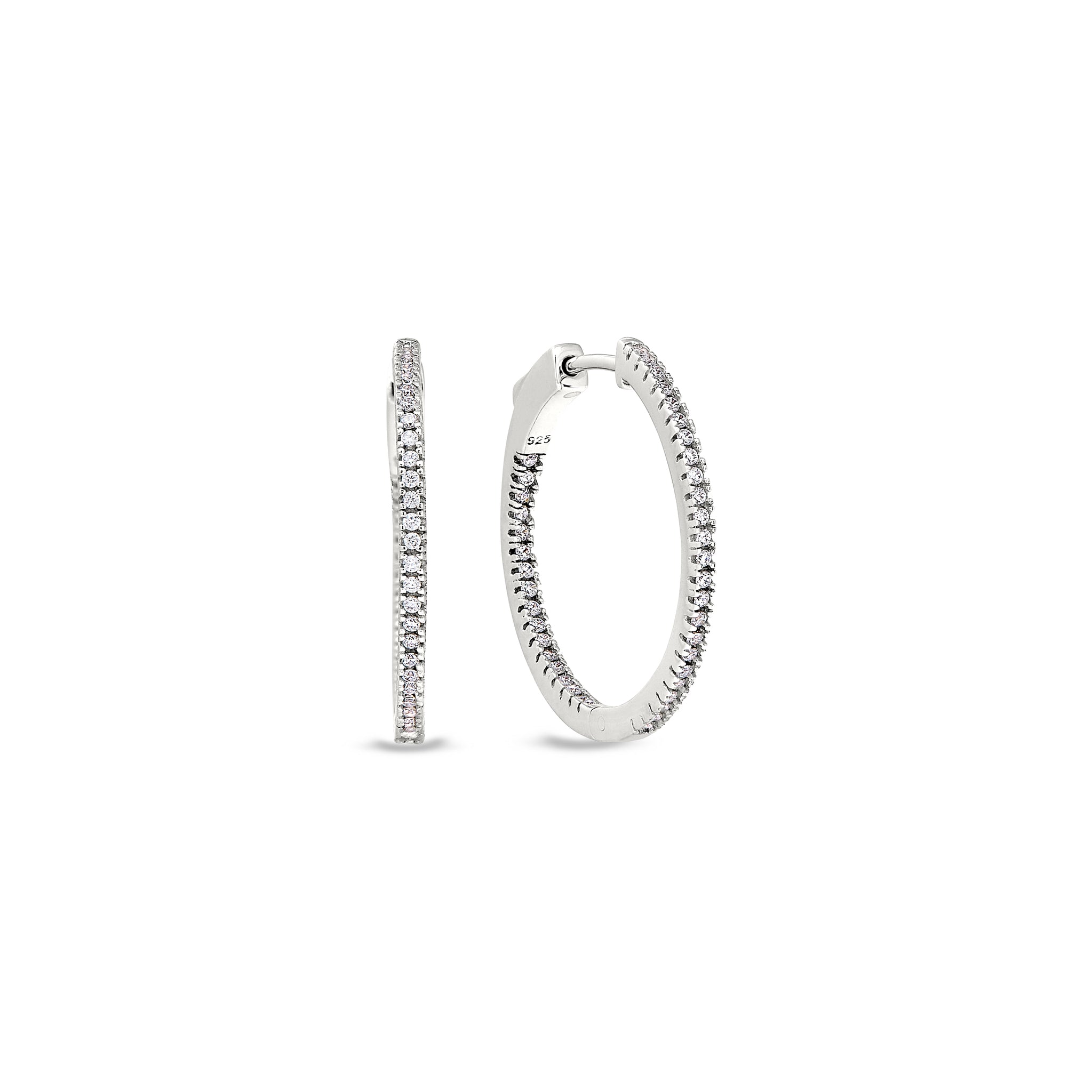 Discover elegance with our platinum finished sterling silver medium hoops adorned with inside-out simulated diamonds. Elevate your style effortlessly.