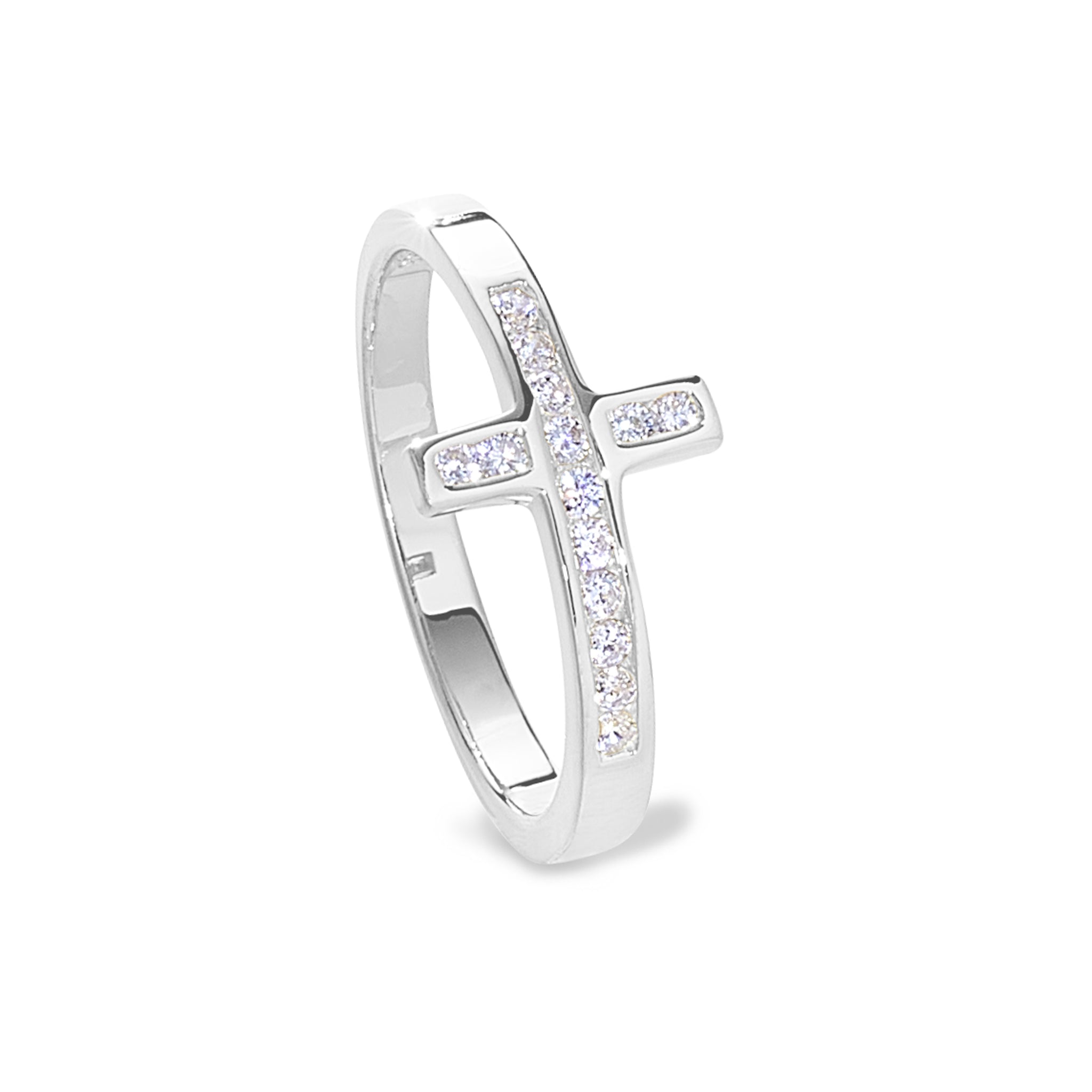Elevate your style with our platinum finished sterling silver sideways cross ring. Adorned with micropave simulated diamonds
